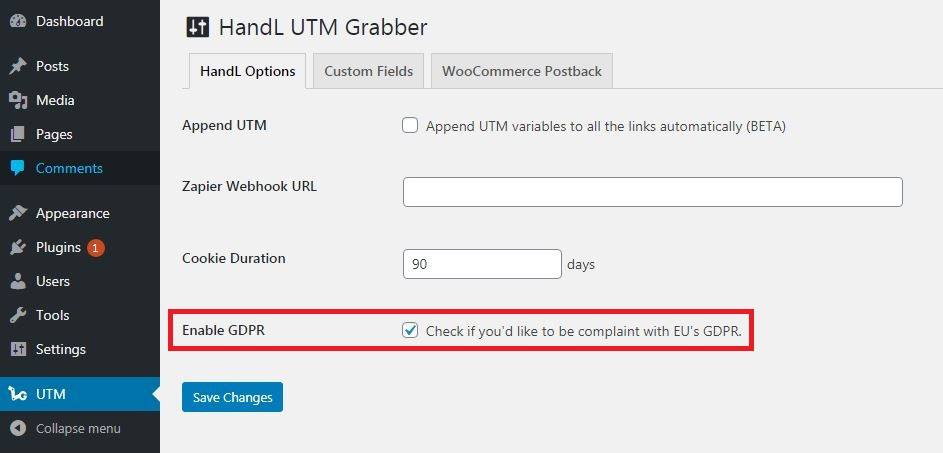 1.Click UTM, check the "Enable GDPR" box in the HandL Options tab and save changes