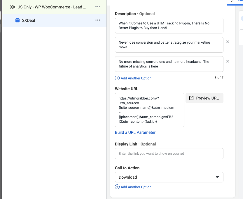 In order to track your ads on Facebook Ads, make sure you included UTMs to your final destination URL (landing URLs) as shown below