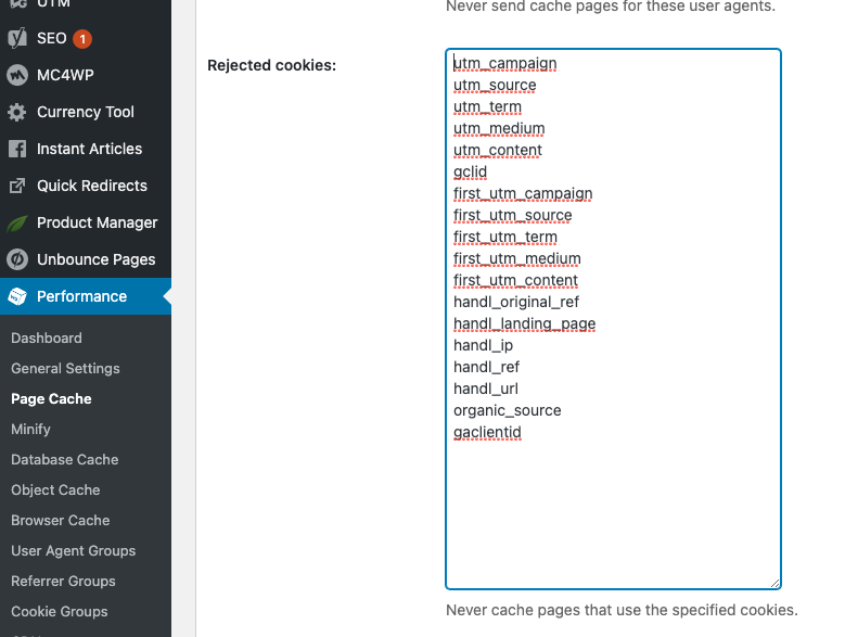 Go to Performance > Rejected cookies and copy/paste the following text in there and save