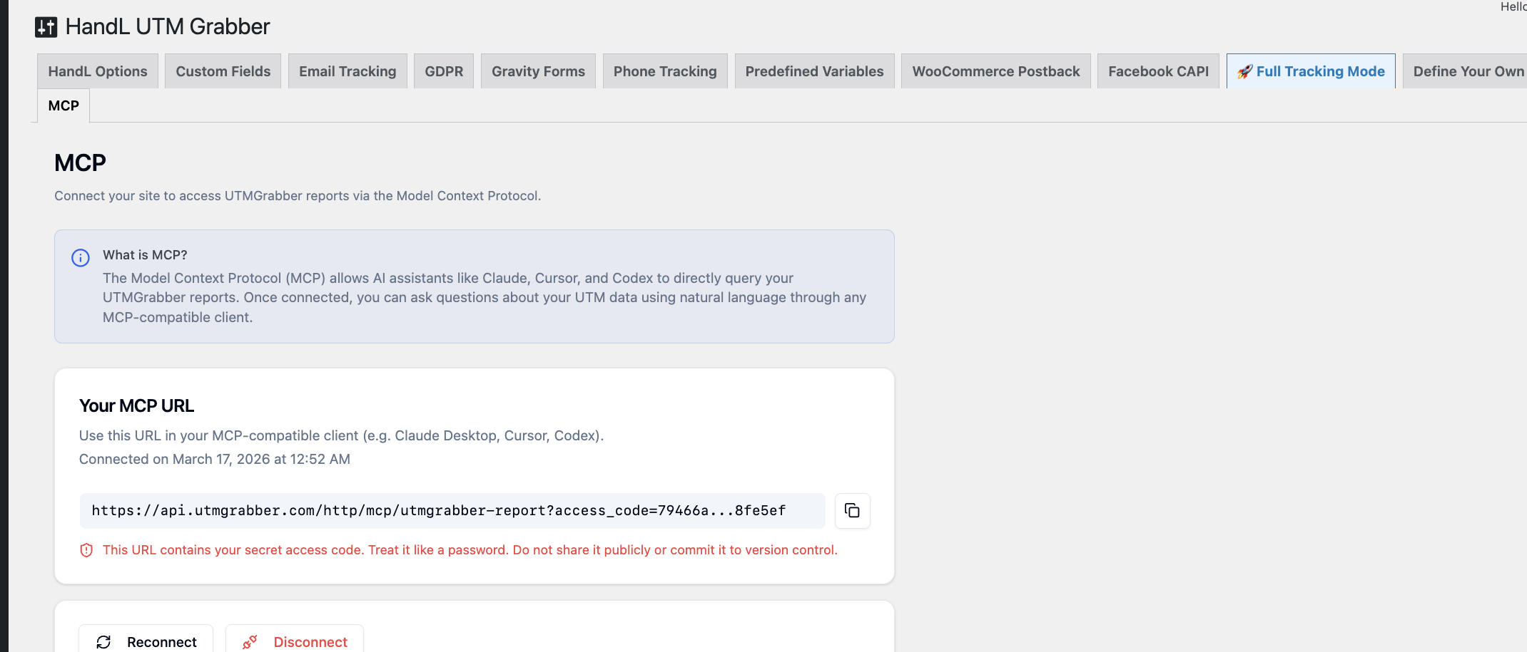 The MCP feature allows you to connect your WordPress site to AI assistants like Claude Desktop, Cursor, and Codex using the Model Context Protocol. Once connected, you can query your UTMGrabber reports using natural language directly from any MCP-compatible client.