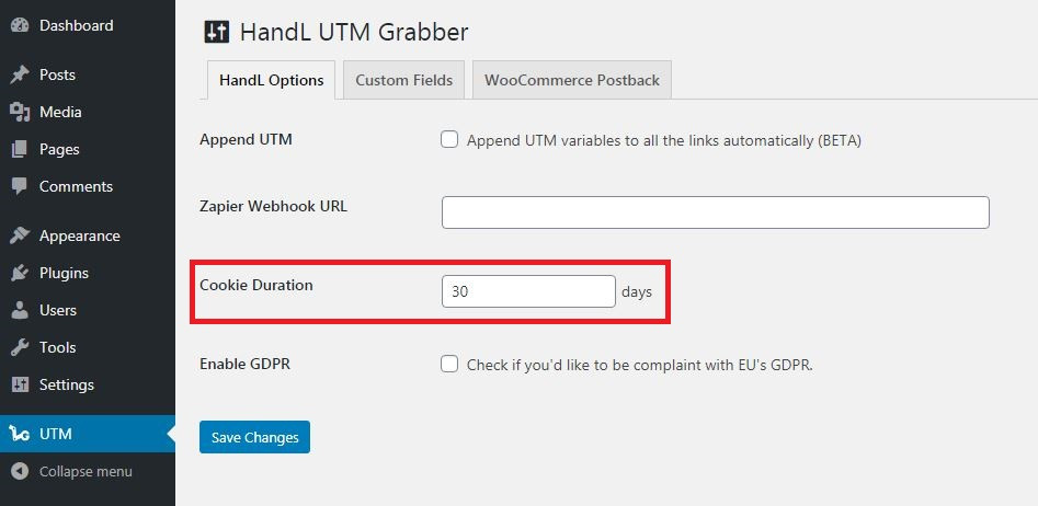1.Click UTM and set the cookie duration below the HandL Options tab