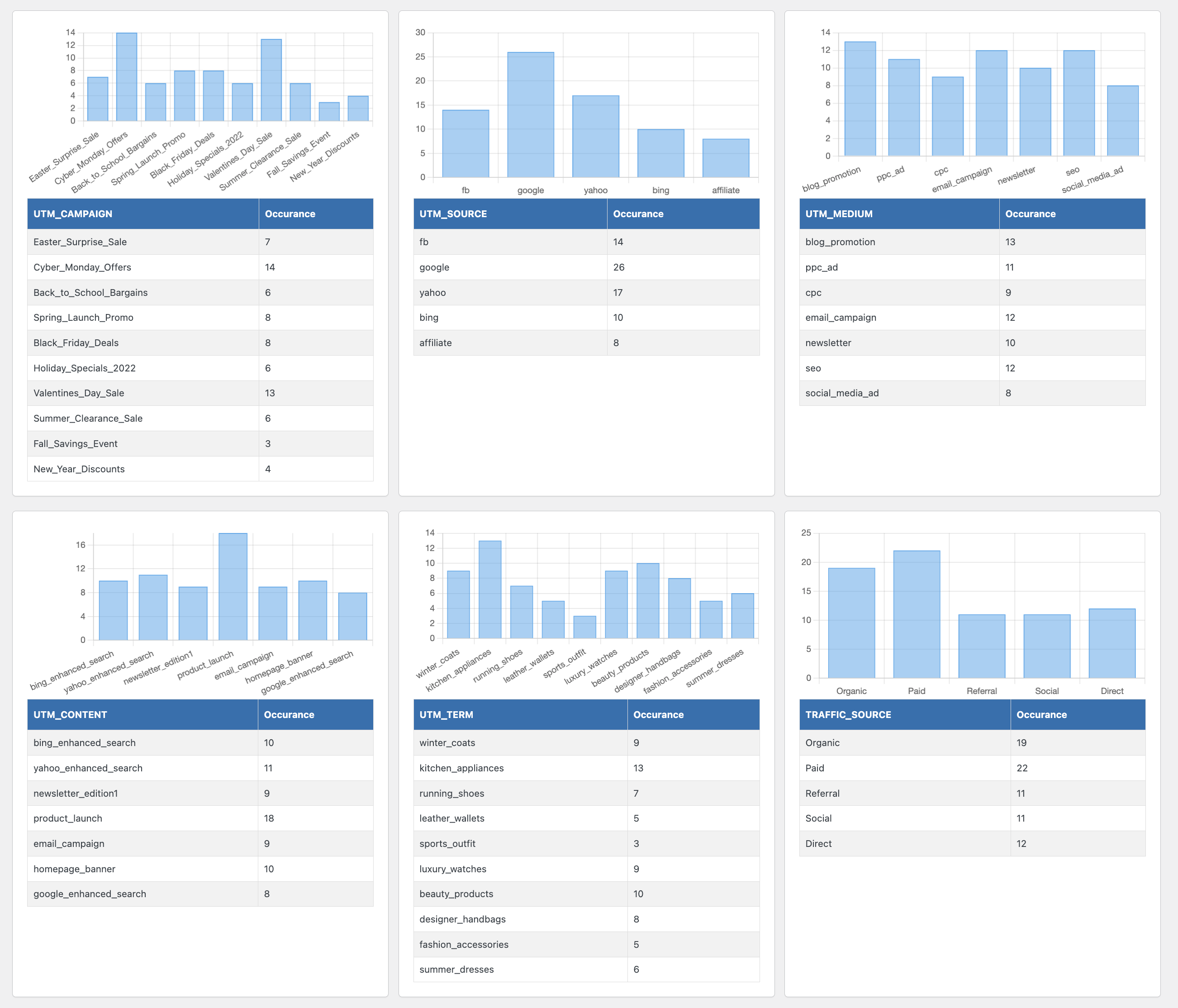 3. Generate a report, customizing it with different groupings like utm_campaign, utm_medium, utm_source, utm_content, utm_term, and traffic_source.