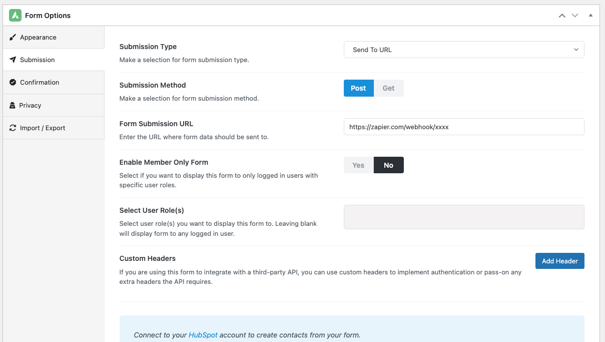 If you want to send this data outside of your WordPress like Salesforce or Hubspot. You can use submission type as "Send To URL" to send the data to your Webhook in Zapier. And you can sync the data to your favorite CRM within Zapier.