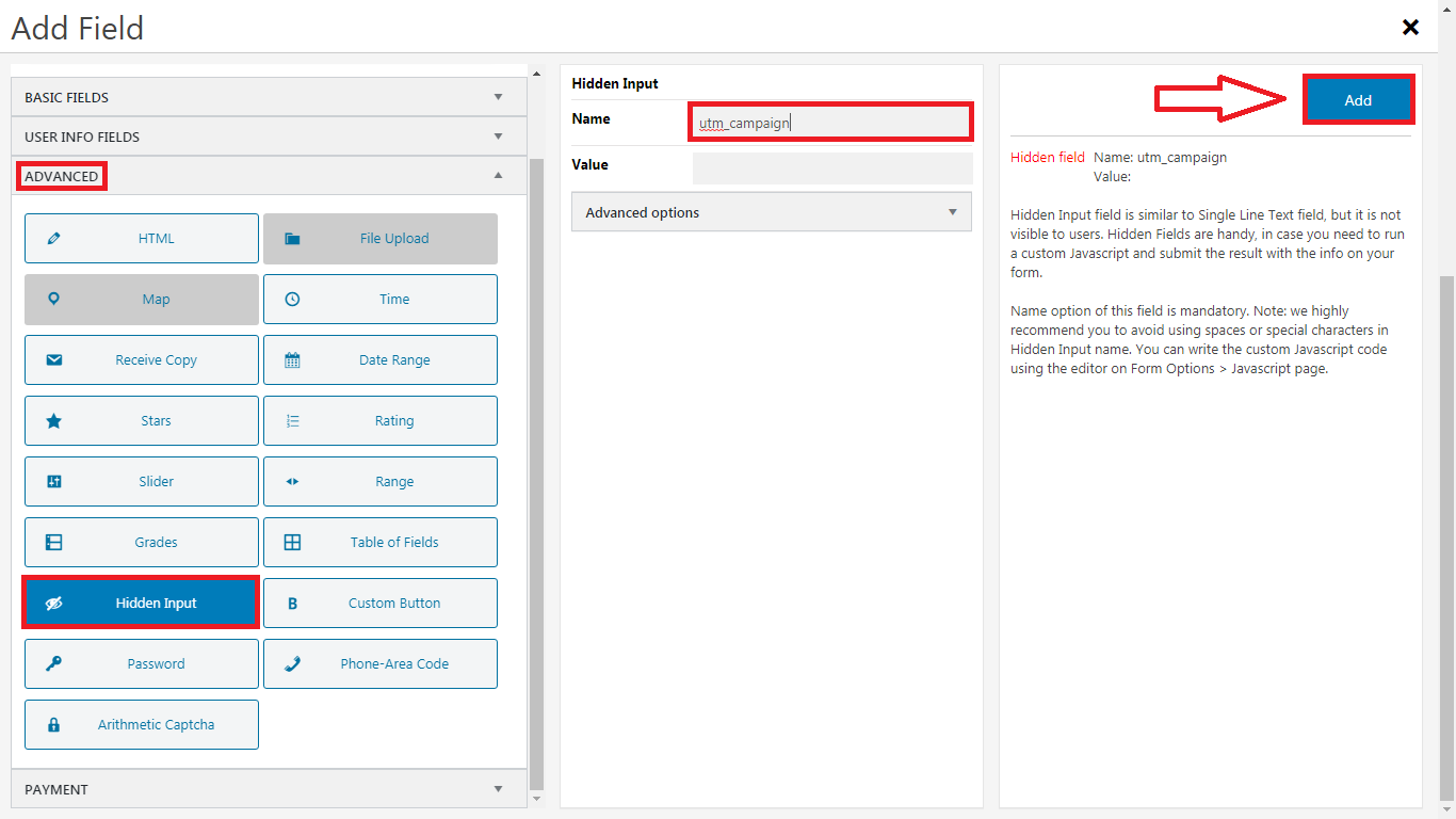 4.Select "Hidden Input" in the "Advanced" section, type the UTM tag to the "Name" field and click "Add"