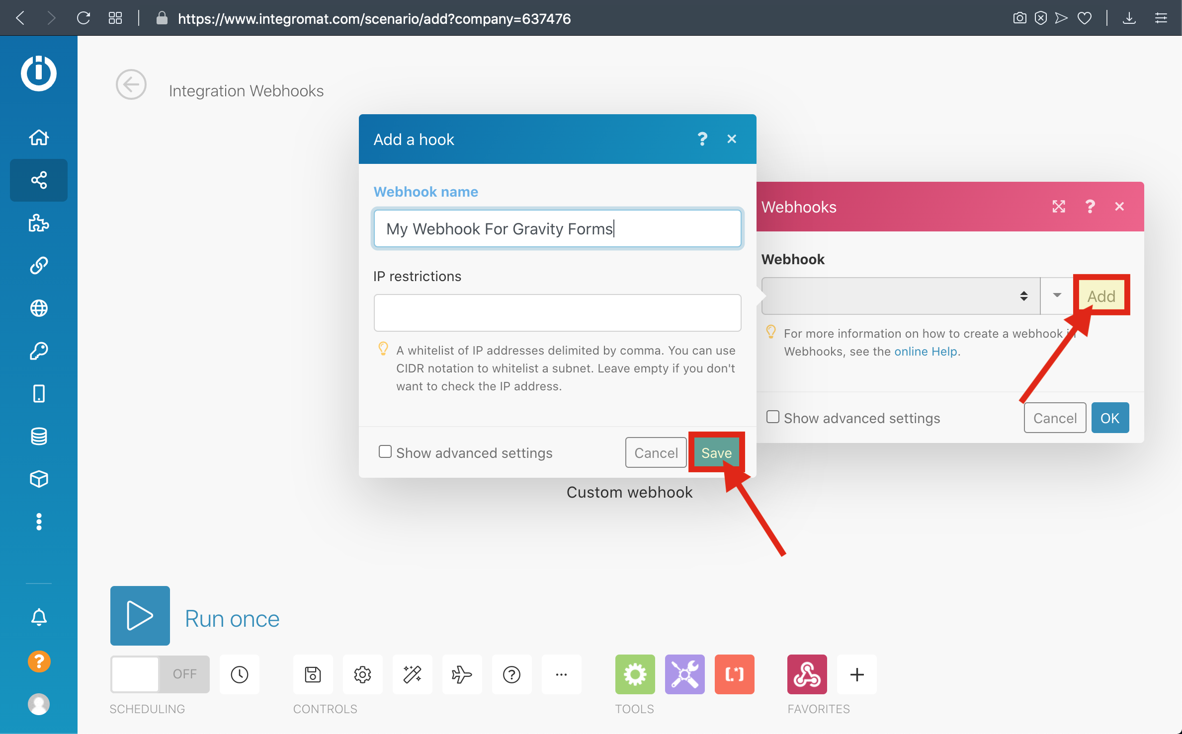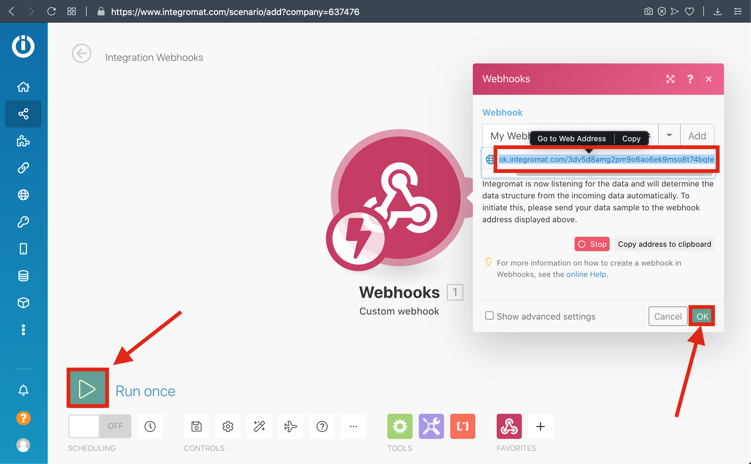 5-) Copy the Webhook URL to the clipboard and click 'OK' then click Run Once Button