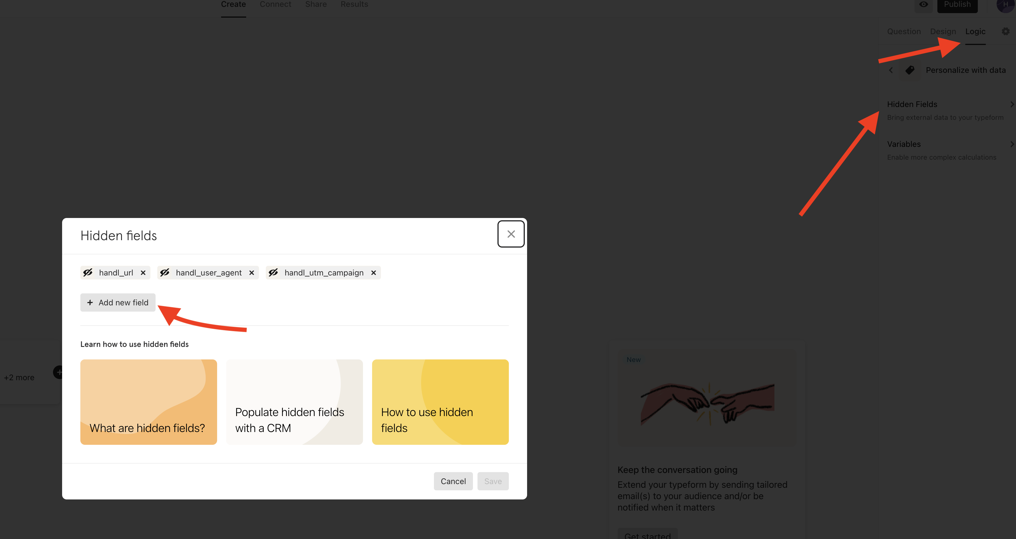 Create custom fields in typeform (Optional - only if you'd like to capture more than utm e.g. handl_url)